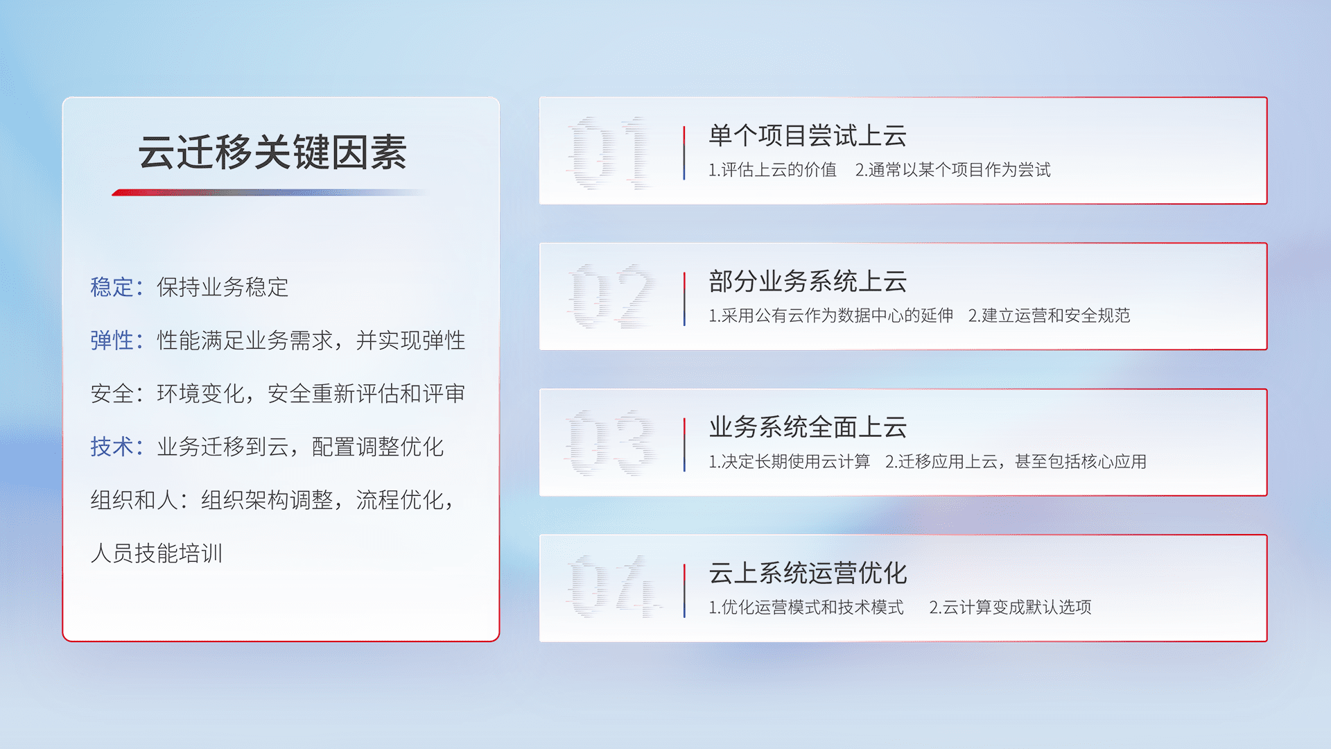 结合实际业务,,,,从规划设计、、、、云平台选型、、、、云原生改造、、、数据迁移、、集成交付,,,迁移全过程为客户识别最佳上云路径,,做好风险识别管理,,,设计网络架构、、身份权限、、安全审计合规、、操作审计、、日志审计、、、监控告警策略、、多站点容灾设计等,,,对云上基础设施进行整体规划,,提升IT治理水平,,,,以满足弹性、、、、高可用、、、、高性能的需求。。。。